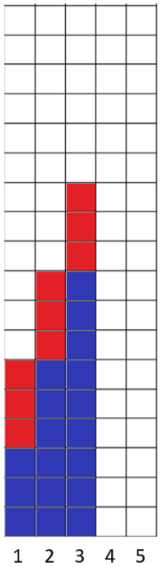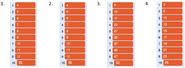 - How do the blue numbers/blocks change in each pattern?
