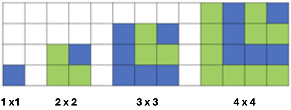 - The first two odd numbers make a 2 × 2 square.